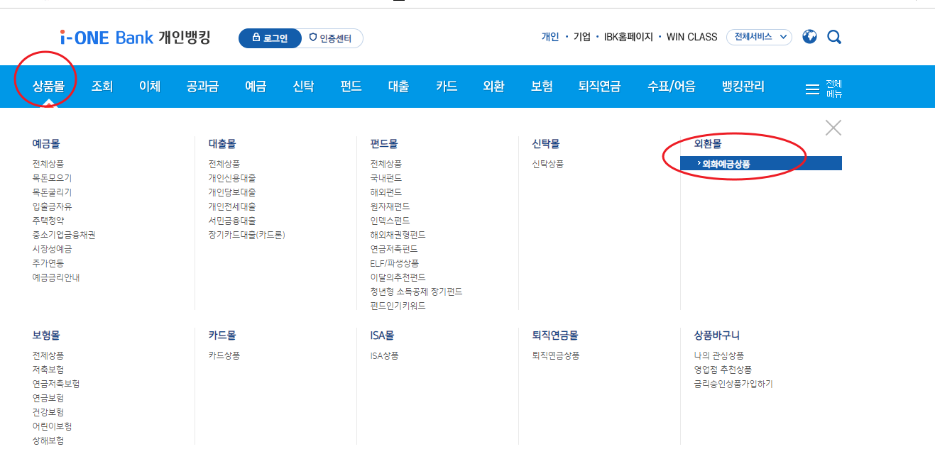 기업은행 인터넷뱅킹-> 상품몰-> 외환몰-> 외화예금상품