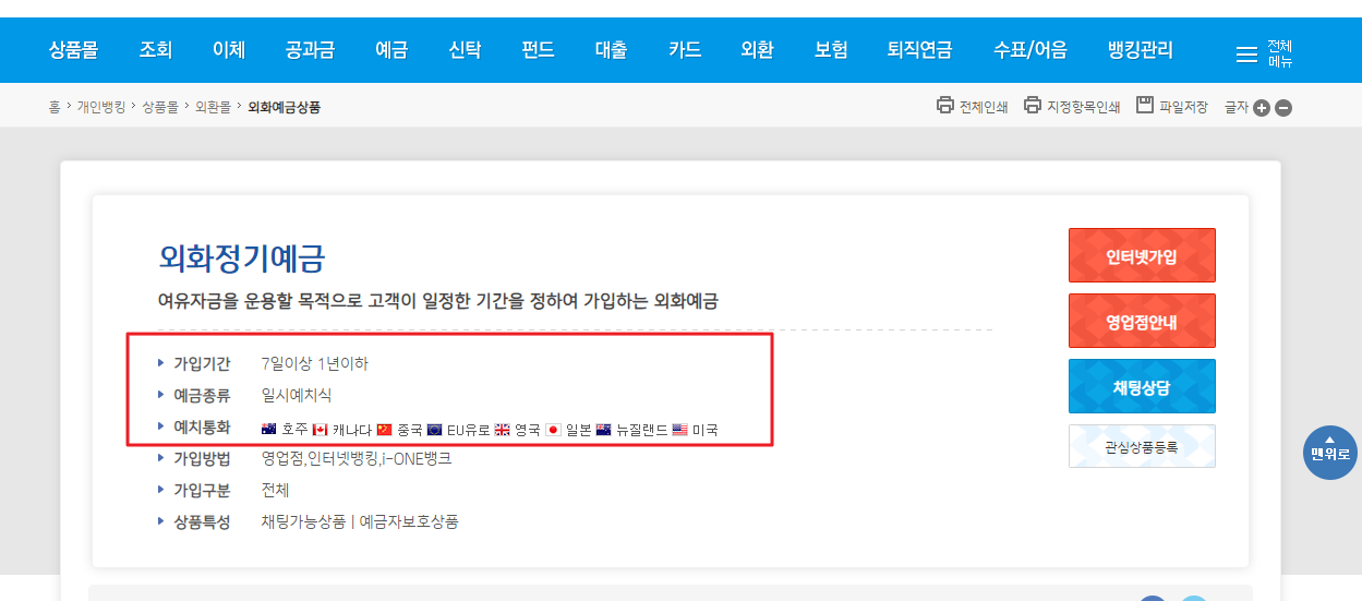 아래쪽을 쭉 스크롤하면 외화 정기 예금 란을 발견할 수 있습니다.