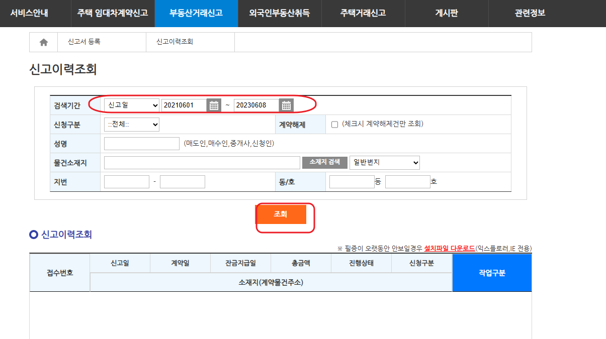 4. 검색기간은 최초 신고한 기한을 포함하여 넉넉하게 설정합니다
