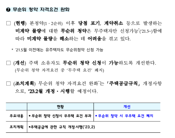 무순위청약 자격조건 완화는 <주택공급규칙>개정사항으로, 2023년 2월에 개정&시행할 예정입니다.