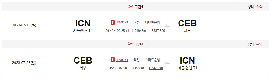23년 5월에 결제-> 출발편 : 7월 18일, 돌아오는편: 7월 23일