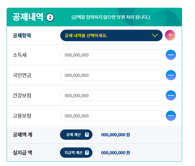 공제계산, 지급액 계산을 누르면 현재 까지 작성한 내용이 자동 공제 및 계산되어 나옵니다.