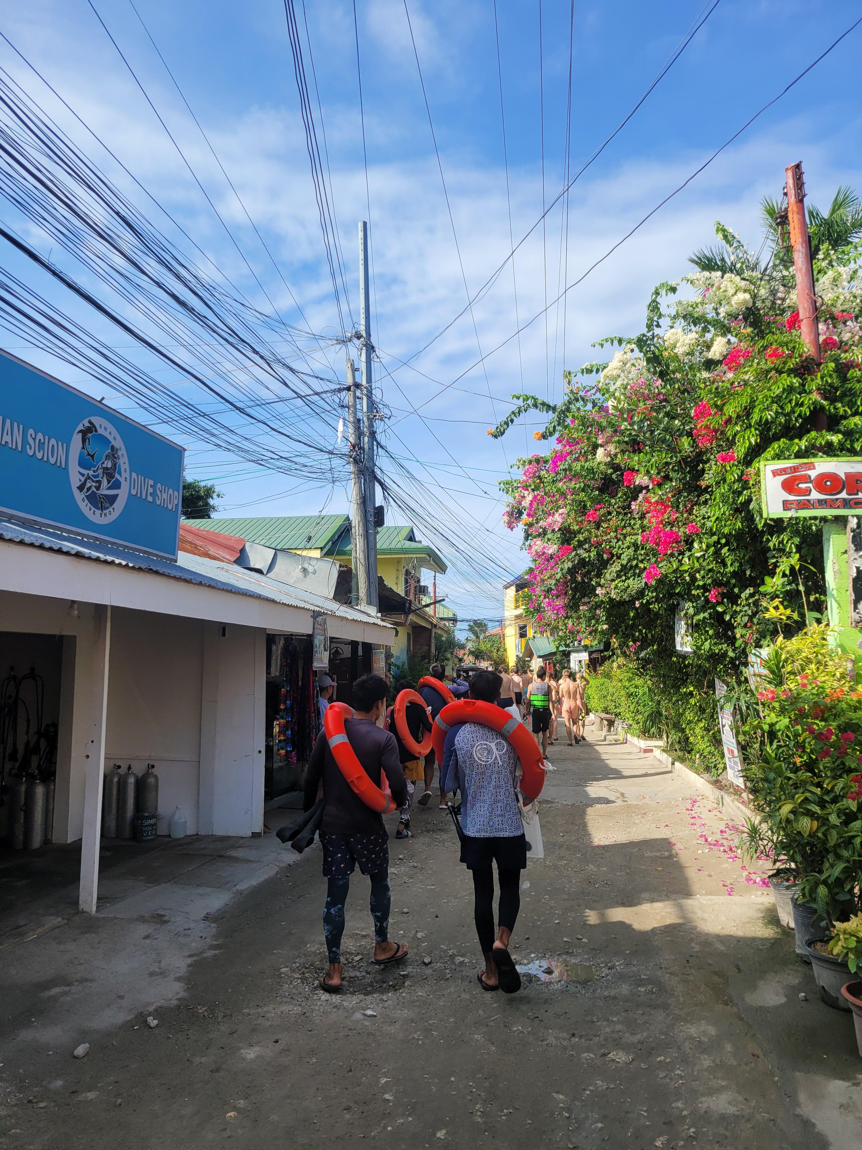 모알보알 칠리바 부근에 다이빙샵에서는 한무리의 가이드들과 투어객들이 스노쿨링하러 가고있네요
