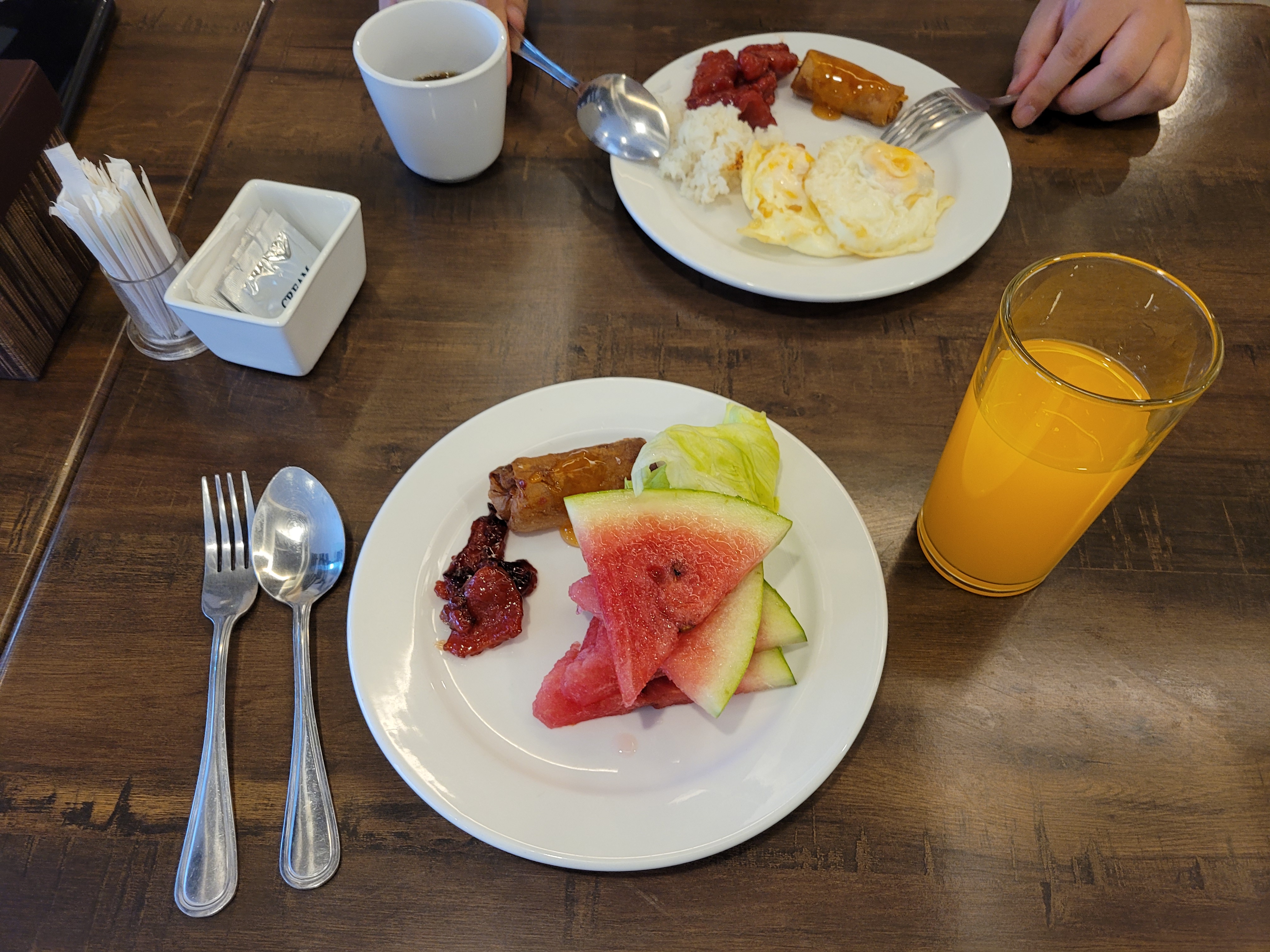 간단하게 어메리칸식 조식(식빵, 에그, 샐러드)에 쥬스, 수박을 먹기엔 좋았습니다
