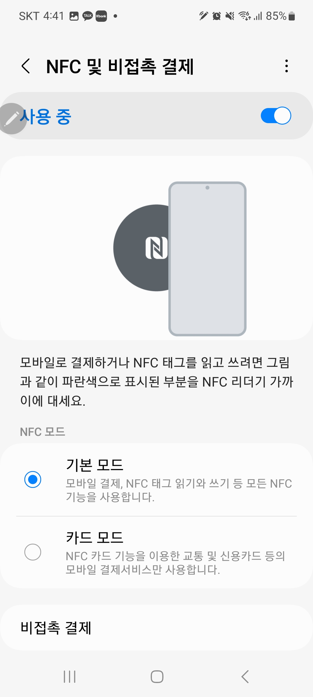 설정에서 NFC모드를 켜줍니다.