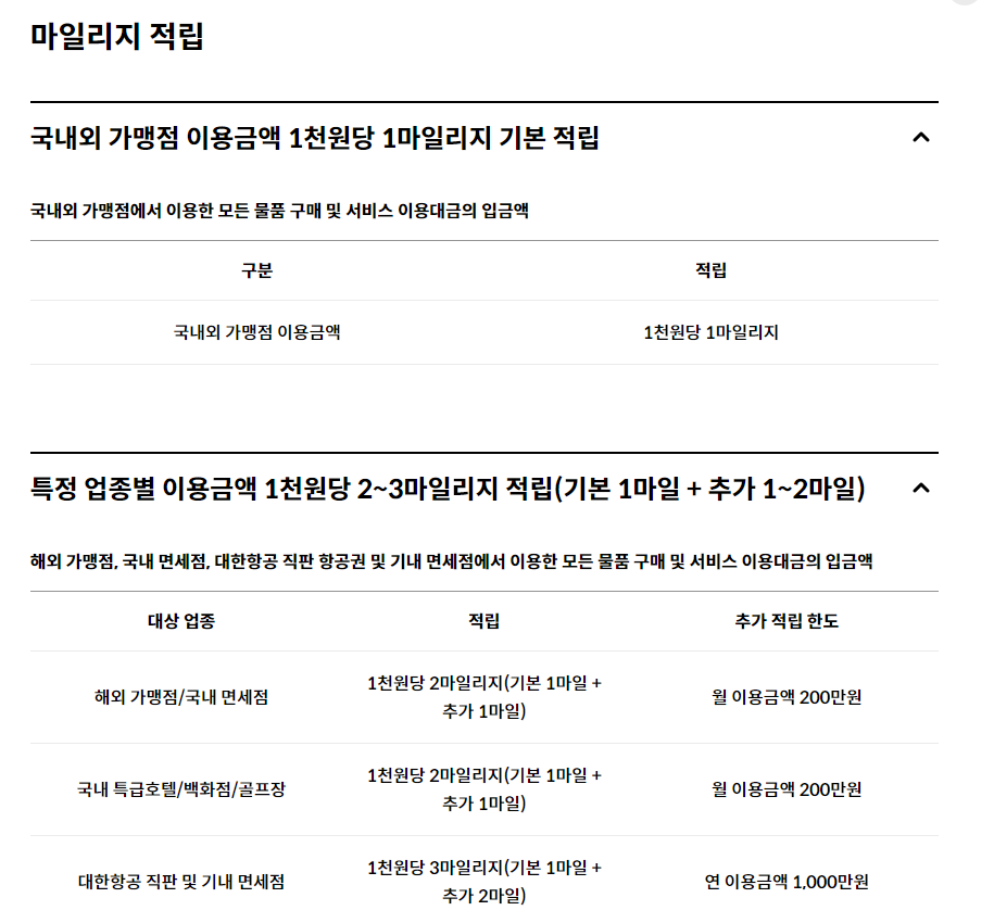 국내외 가맹점 이용금액 1천원당 1마일리지 기본 적립입니다