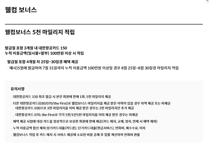 제가 이 카드를 선택한 이유 중 또다른 하나는 바로 웰컴 마일리지입니다.