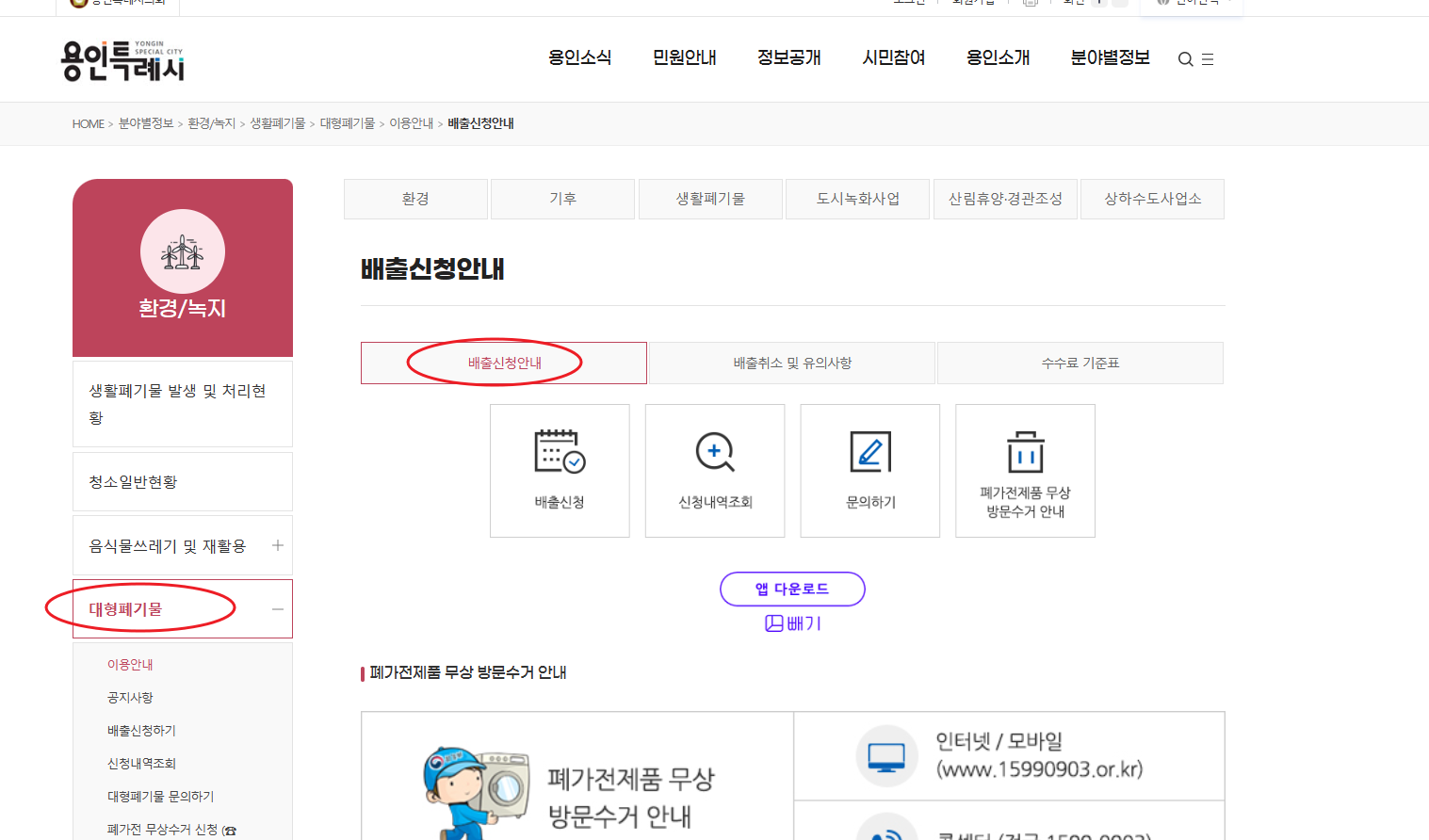 배출신청안내 < 이용안내 < 대형폐기물 < 생활폐기물 < 환경/녹지 < 분야별정보 < HOME : 용인시청 대표포털 (yongin.go.kr)
