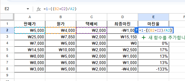 그런 다음 1-((원가+택배비)/판매가)를 해줍니다.