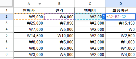 아래는 제가 마구잡이로 판매가와 원가 그리고 택배비를 잡아보았습니다.