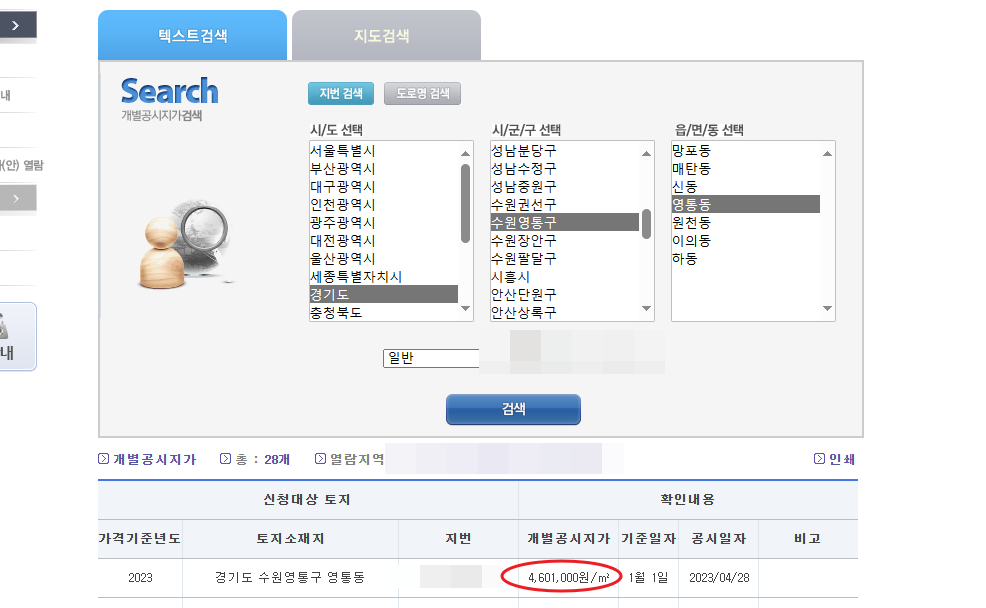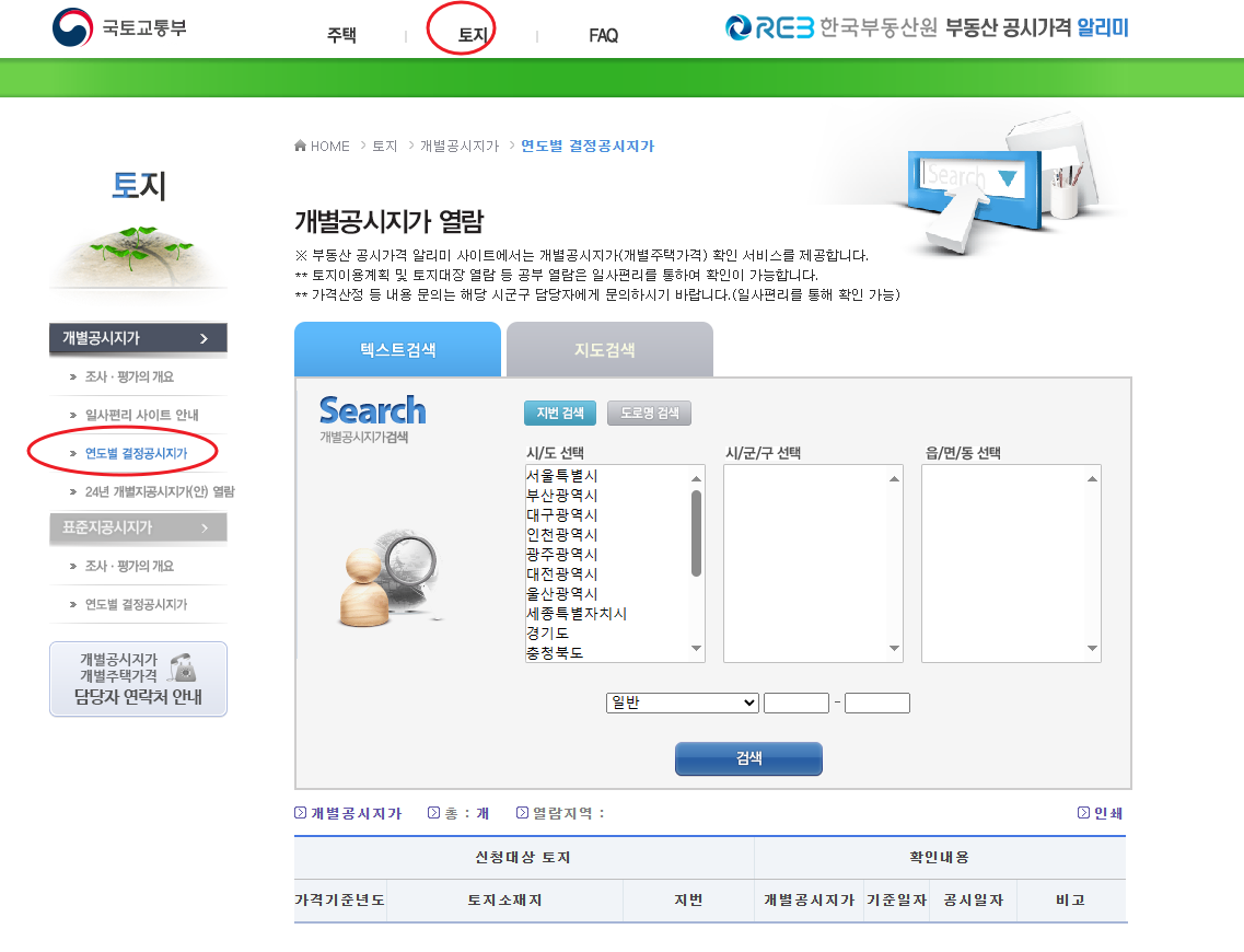 토지->연도별 결정 공시지가 검색