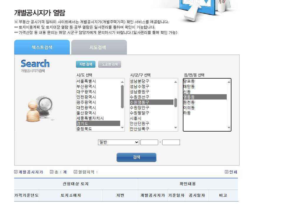 열람하고자하는 개별공시지가의 주소지를 입력합니다.