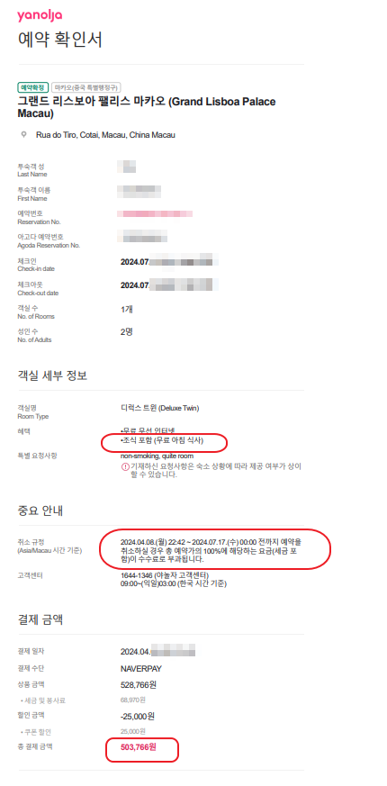 자, 이렇게 마카오 5성급 호텔 예약을 마쳤습니다.