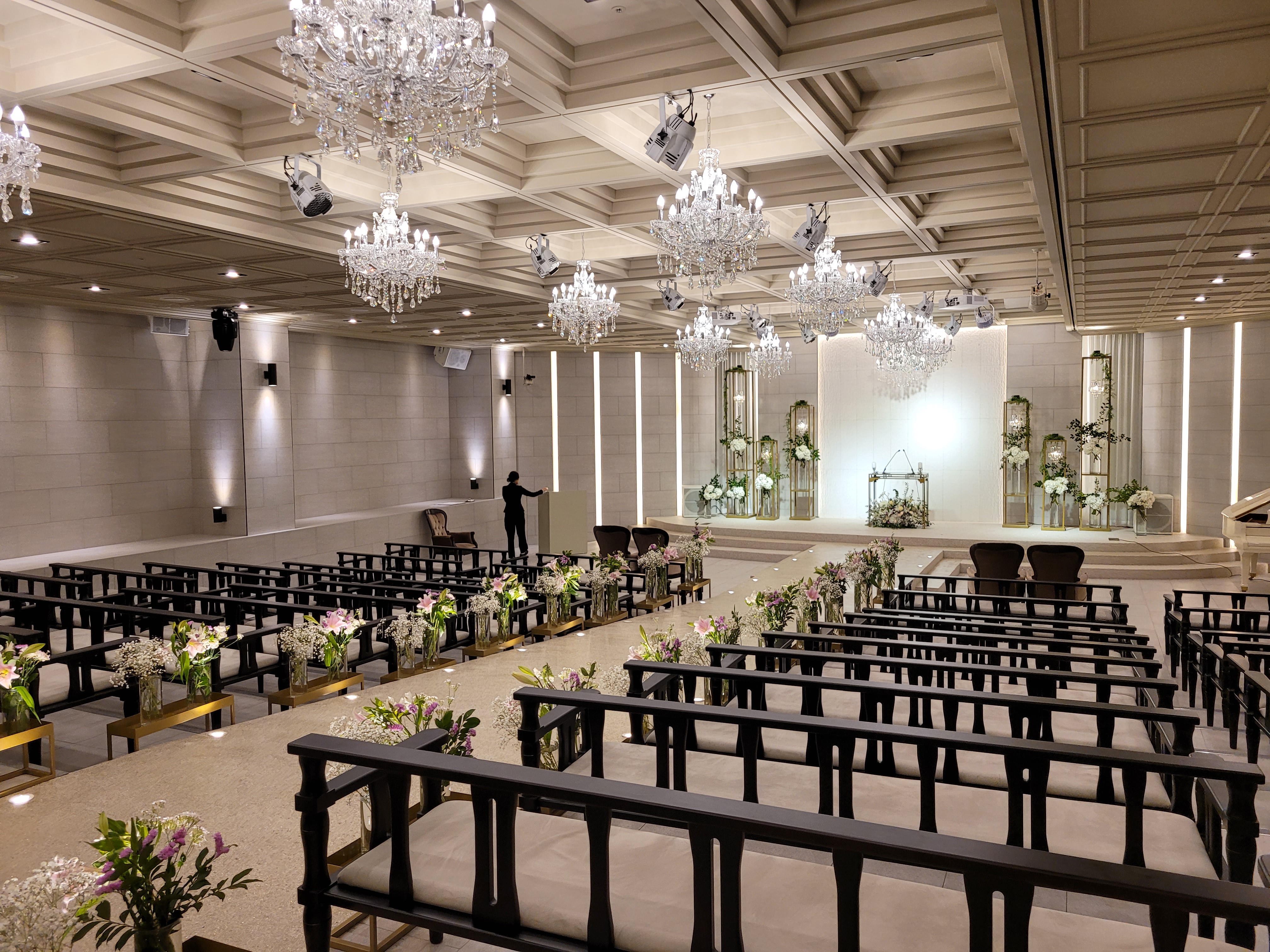 하객석에서부터 점점 무대쪽으로 내려가는 형태라서 사각지대없이 신랑신부에게 집중할 수 있어 좋다.
