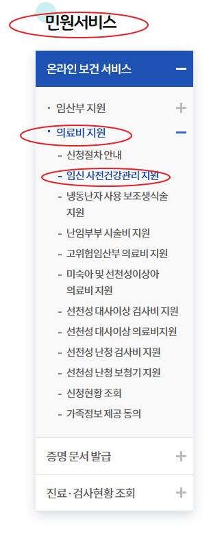 신청 현황 및 서비스 선택 > 임신 사전건강관리 지원 > 의료비 지원 > 온라인 보건 서비스 > 민원서비스 > e보건소 공공보건포털 (e-health.go.kr)