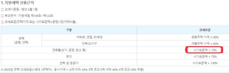 건물분 재산세 : 126,404,345 (건축물시가표준)* 70% (공정시장가액비율70%) * 세율 0.25%