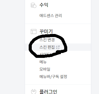 꾸미기 탭의 스킨편집을 클릭합니다.
