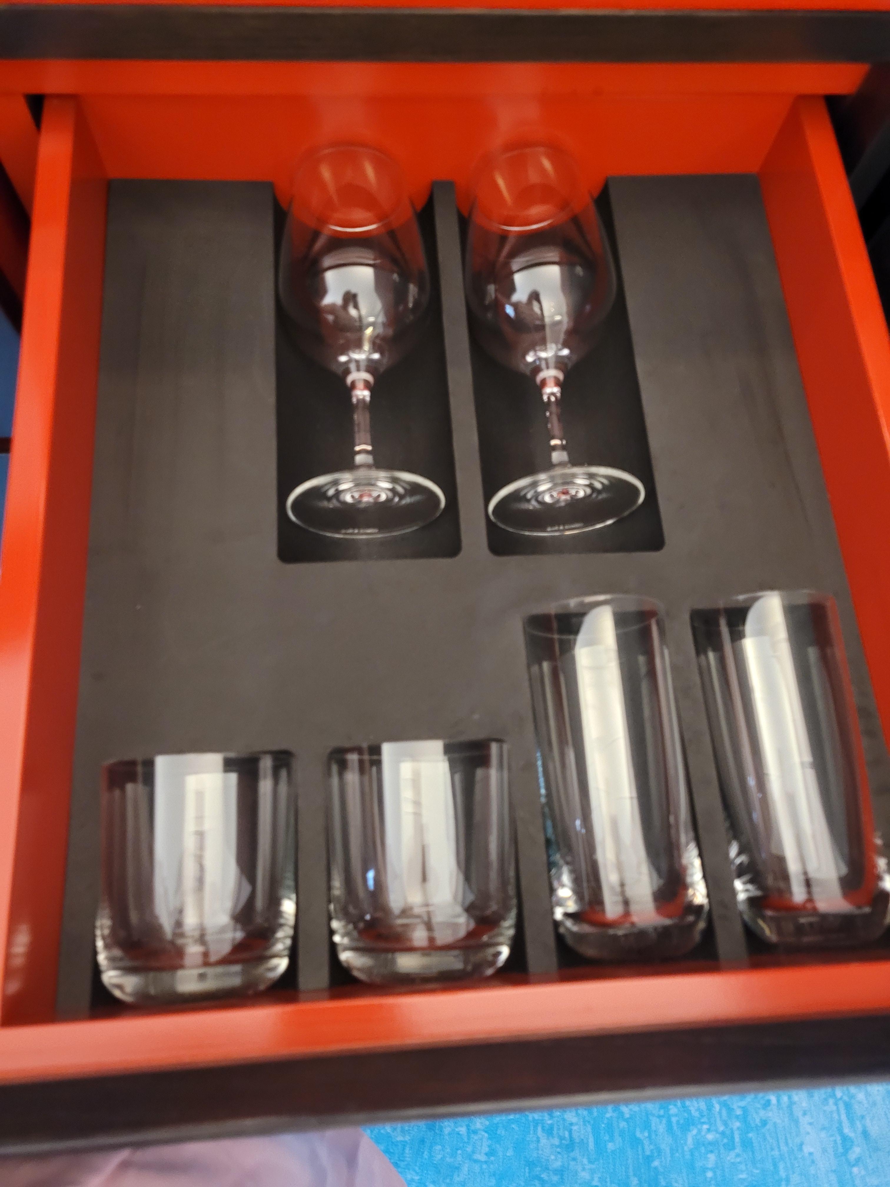 아래 서랍에 티백과 커피캡슐/ 찻잔/ 와인잔 등등이 준비되어있습니다.
