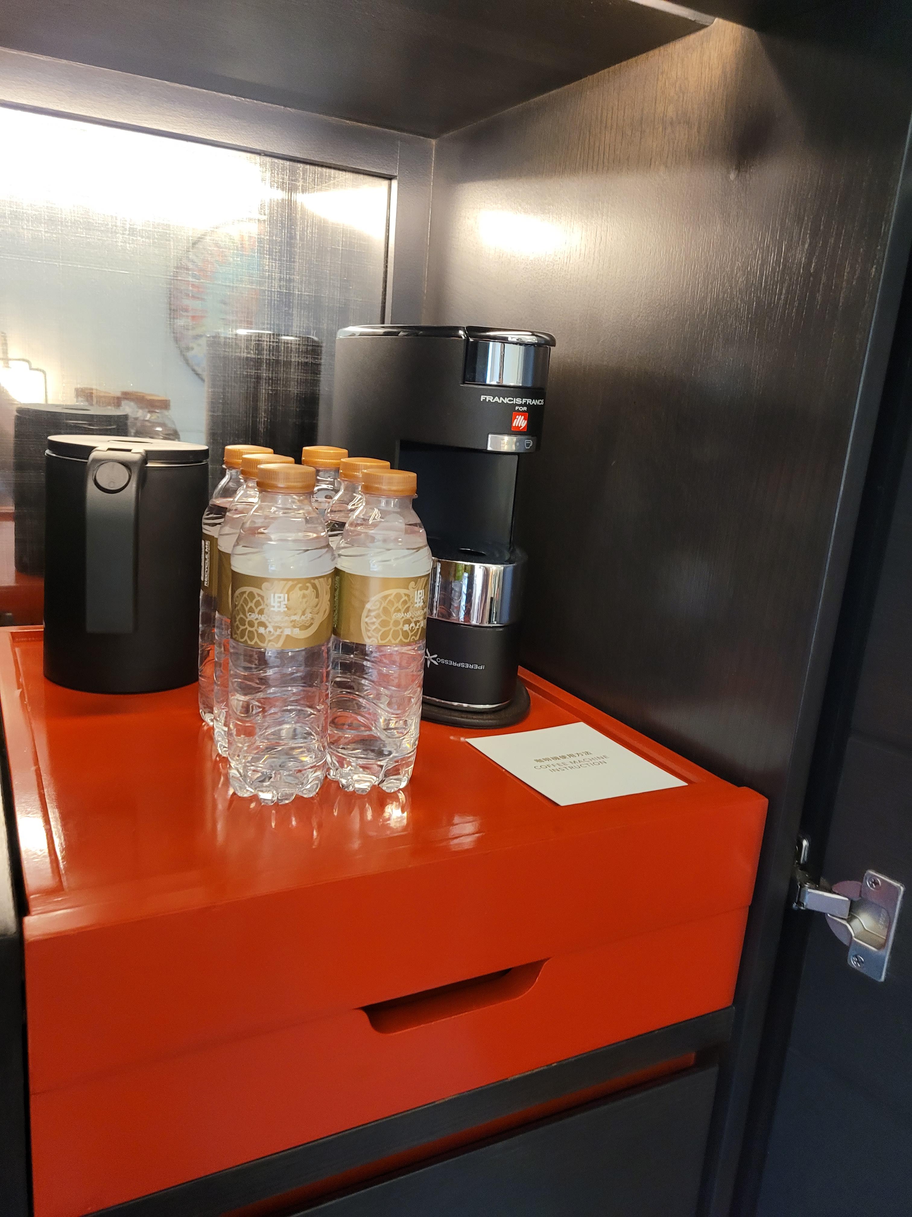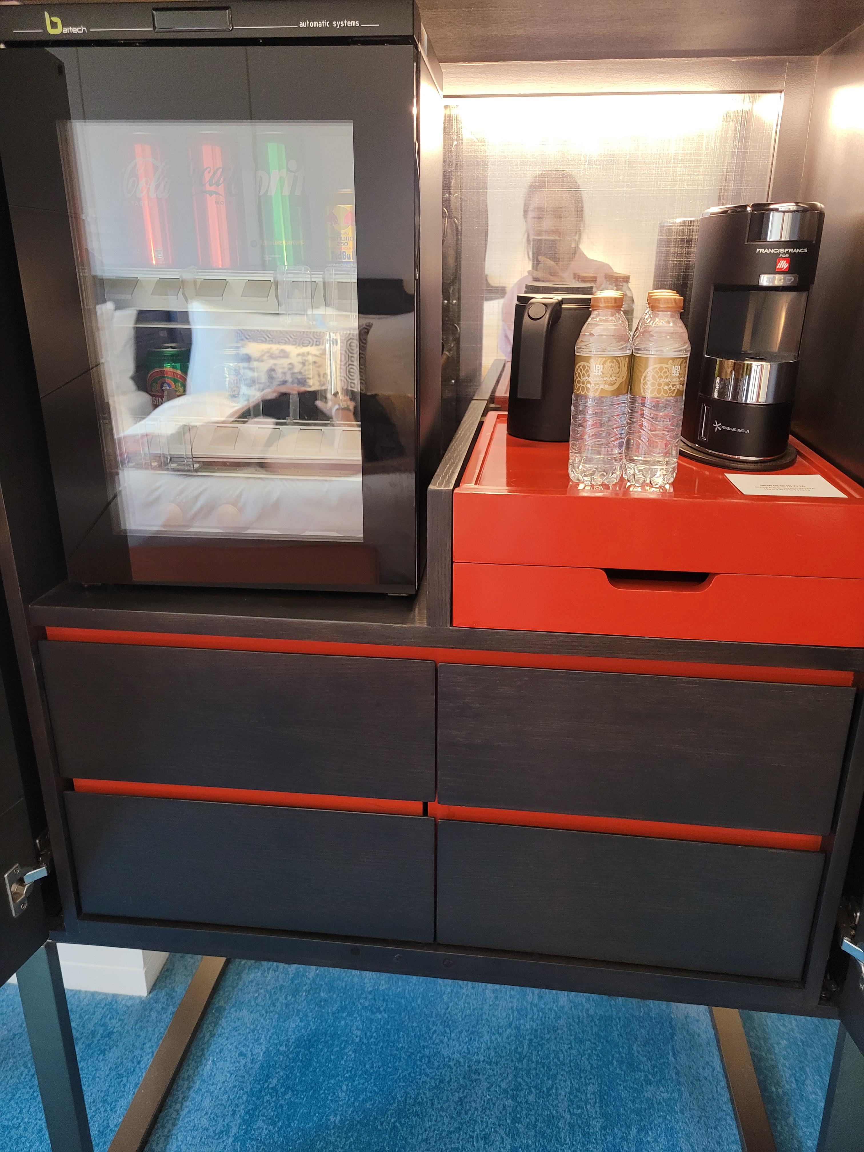 미니바 옆에 커피머신과 커피포트/ 물 등등 구비되어있고
