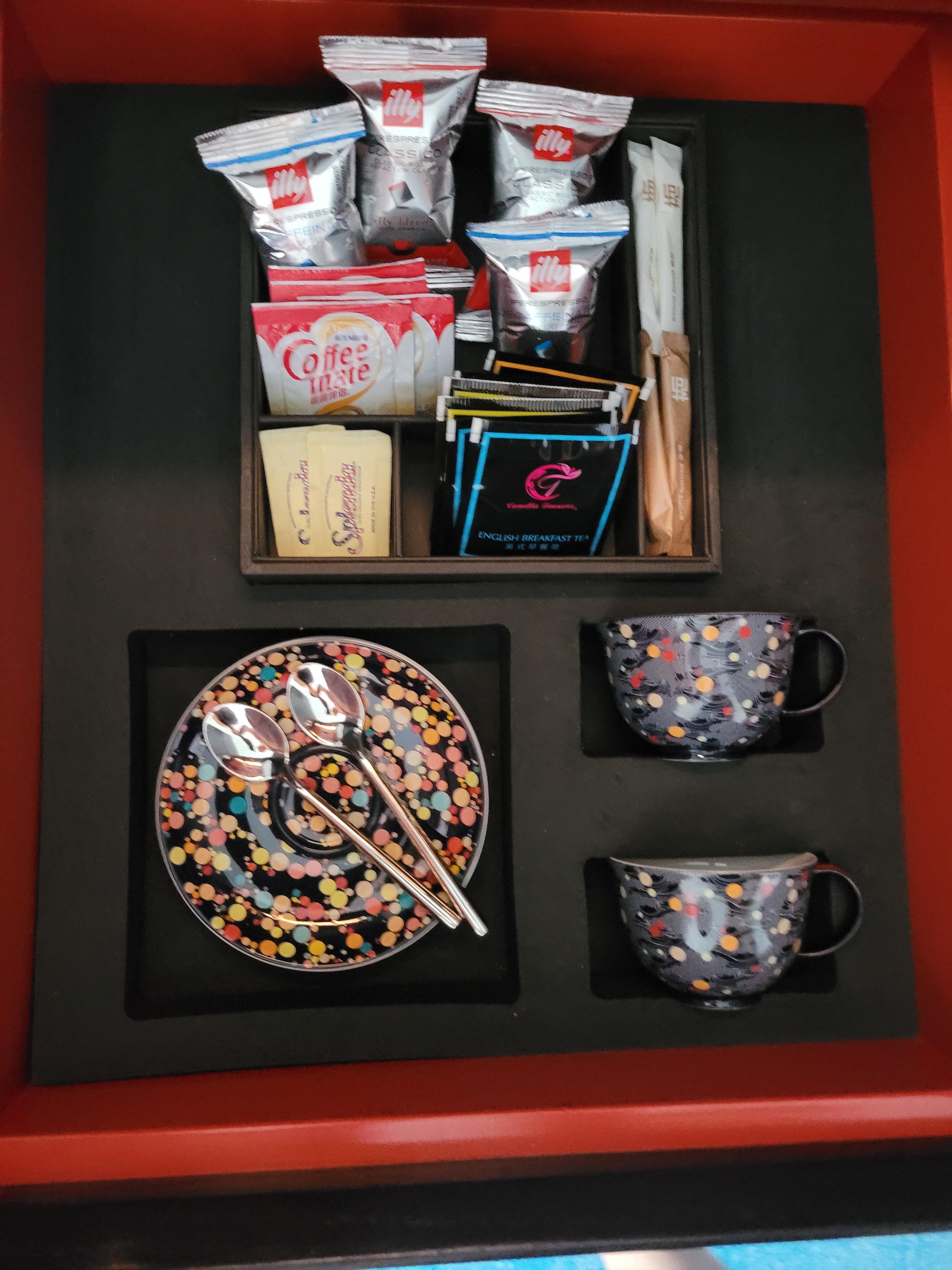 미니바 옆에 커피머신과 커피포트/ 물 등등 구비되어있고