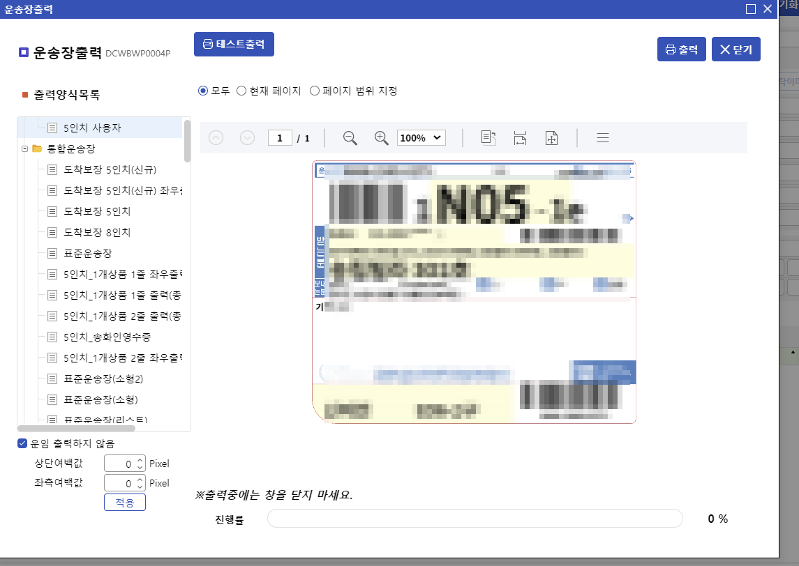 그러면 그토록 출력하고싶어 찾던 "운송장 출력" 화면이 나온다