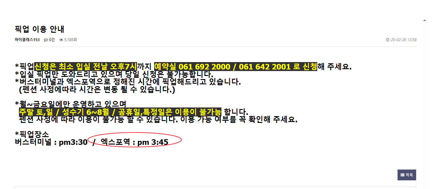 여수하이클래스153 홈페이지에서 픽업 안내 공지를 보았습니다