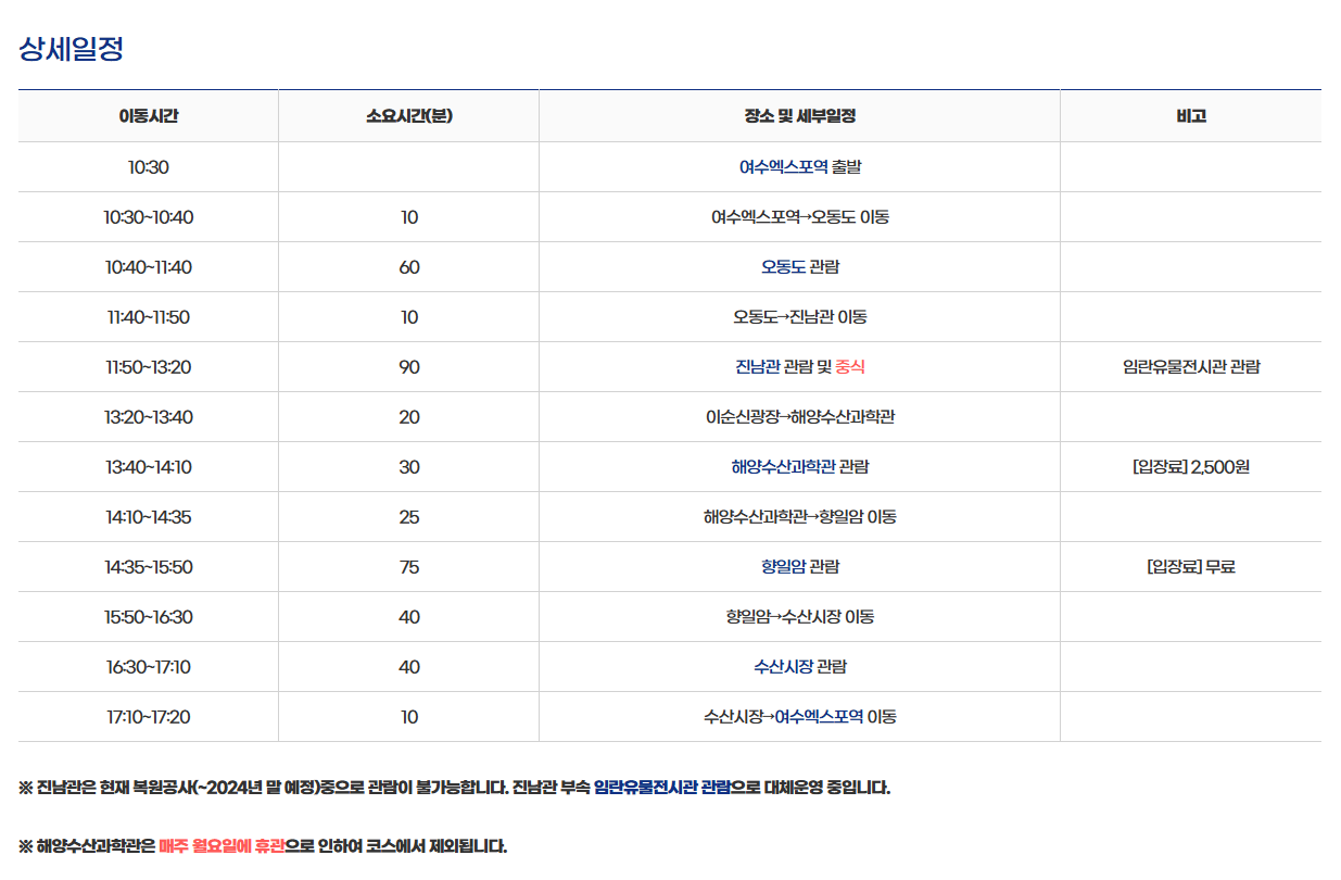 - 출발 시간: 오전 10시 30분 / 여수엑스포역 관광안내소앞