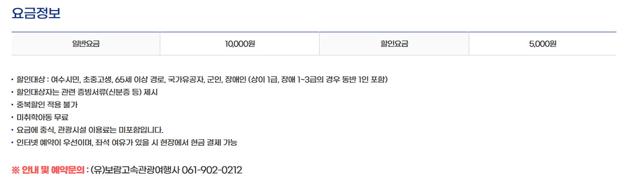 - 할인 요금: 5,000원 (여수시민, 학생, 65세 이상 경로자 등)