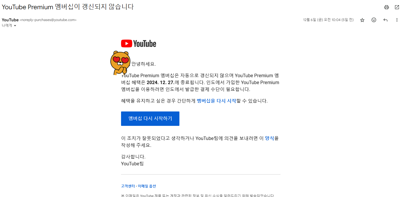 인도 유튜브 프리미엄 맴버십 갱신 종료 통보(24.12.27)
