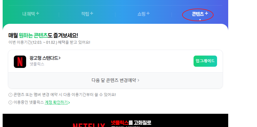 3. 넷플릭스 혜택 활성화: 콘텐츠+ 탭에서 “넷플릭스 광고형 스탠다드”를 선택해요.