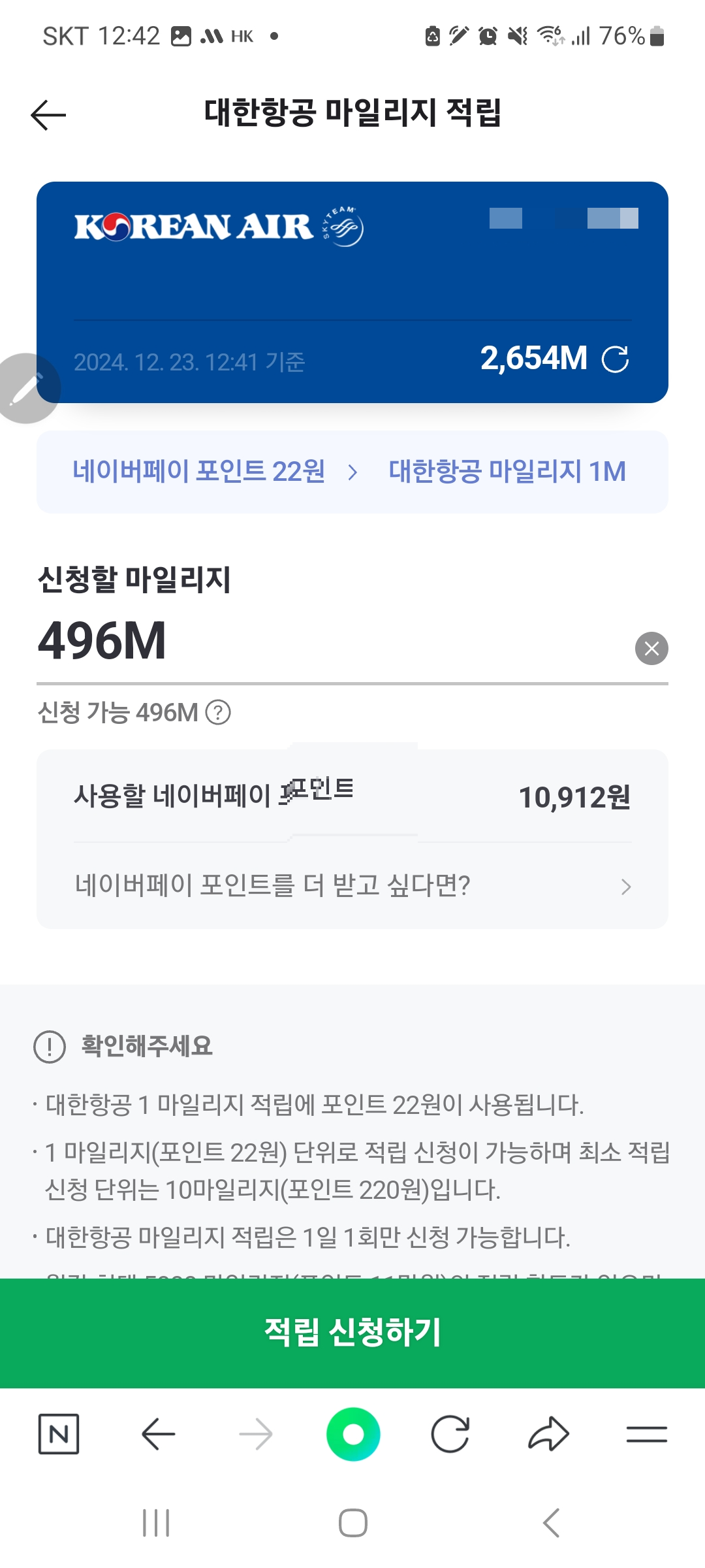 네이버페이 포인트를 대한항공 마일리지로 바꾸는 법(네이버포인트22원->대한항공마일리지1마일)