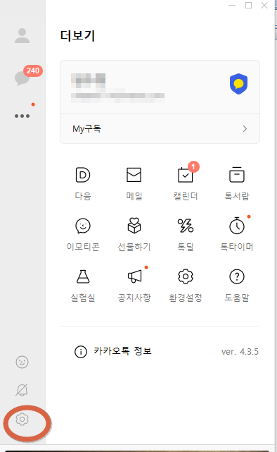- 카카오톡 PC 버전을 실행한 후, 왼쪽 하단의 설정(⚙) 아이콘을 클릭합니다