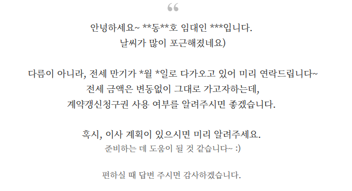 다름이 아니라, 전세 만기가 *월 *일로 다가오고 있어 미리 연락드립니다~