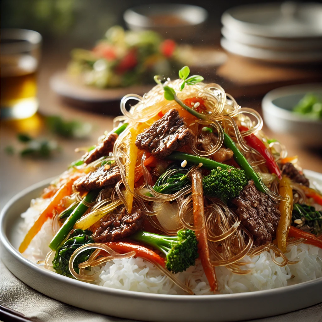 잡채에 들어가는 당면은 고구마 전분으로 만들어졌지만, GI가 중간 정도예요. 하지만 흰쌀밥과 함께 먹으면 혈당이 급상승할 수 있어요.