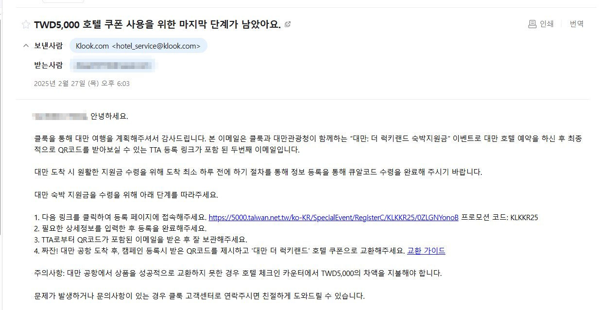 호텔 쿠폰 사용ㅇ르 위한 마지막 단계가 남았어요 라는 메일이 옵니다