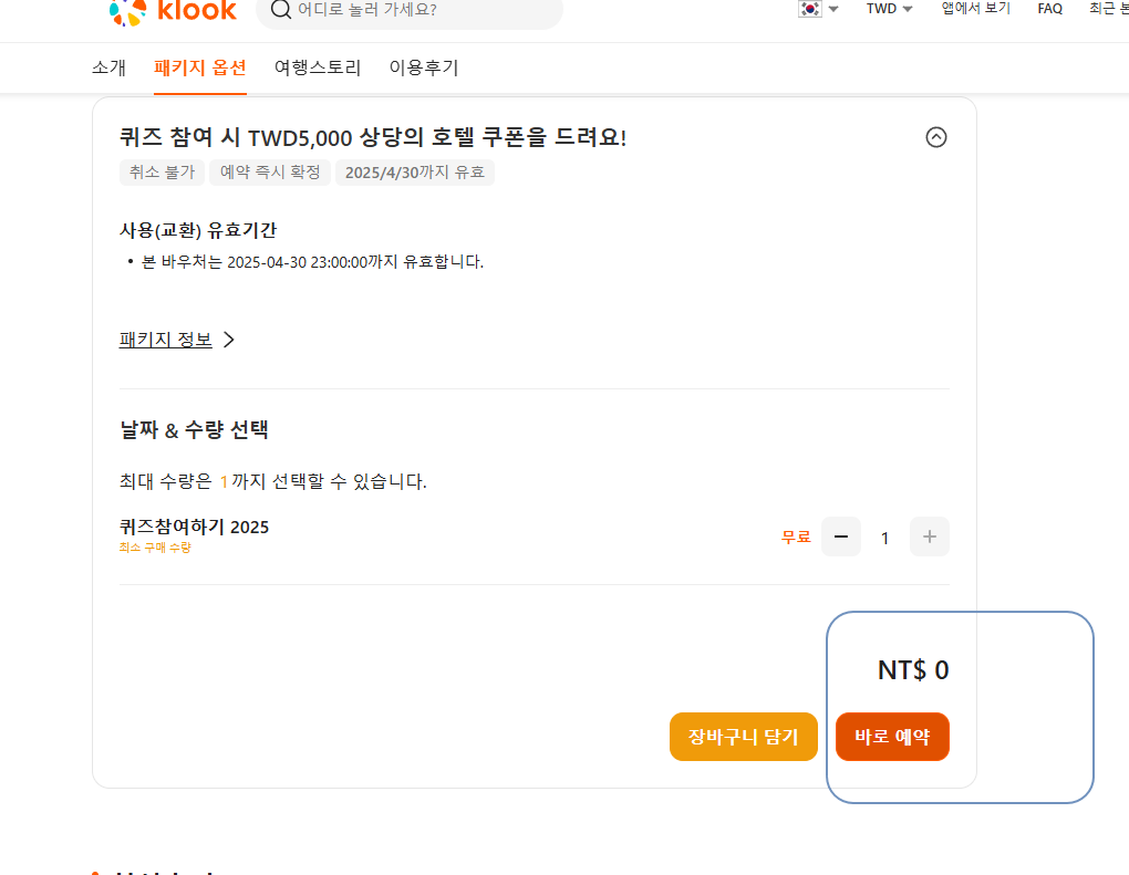 대만 더 럭키랜드 프로모션 퀴즈 참여 페이지 - 클룩 Klook 한국