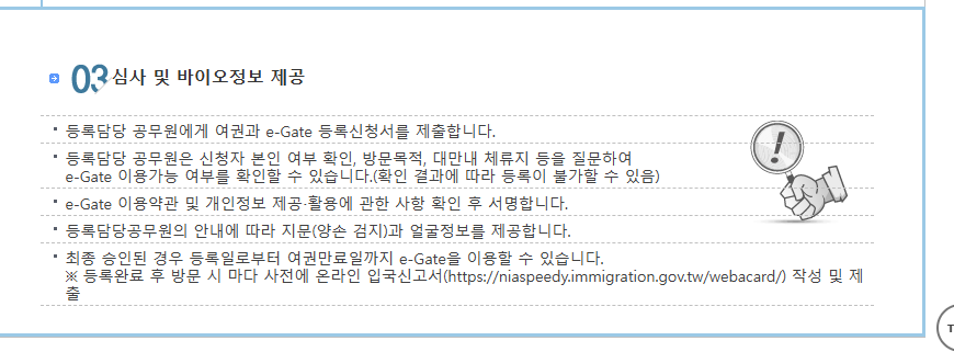 자, 이제 대만 입국할 때 긴 줄에서 기다릴 필요 없죠? ㅎㅎㅎ e-Gate 등록하고 빠르게 입국하자구요!