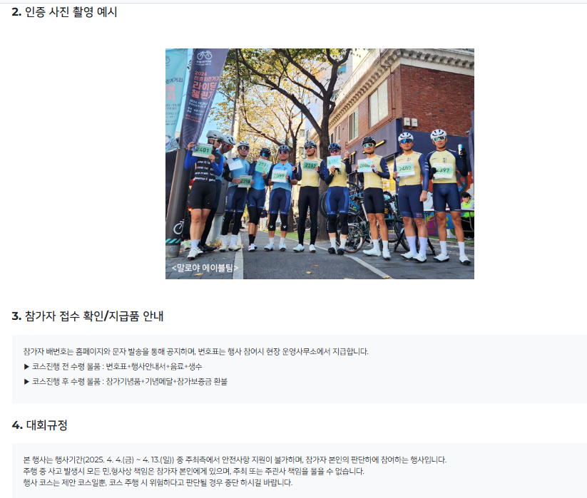 - 인증: 인증 지점에서 참가자 번호를 들고 사진 촬영 후, 홈페이지에 주행 거리와 함께 업로드하면 완료!