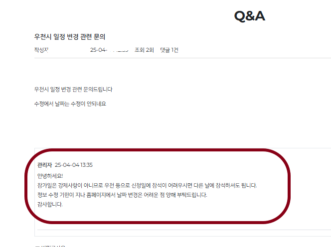 저희가 신청한 4/5(토)에 비가 와서 신청시 기입한 날짜 변경 문의드렸더니 이렇게 답변받았습니다.