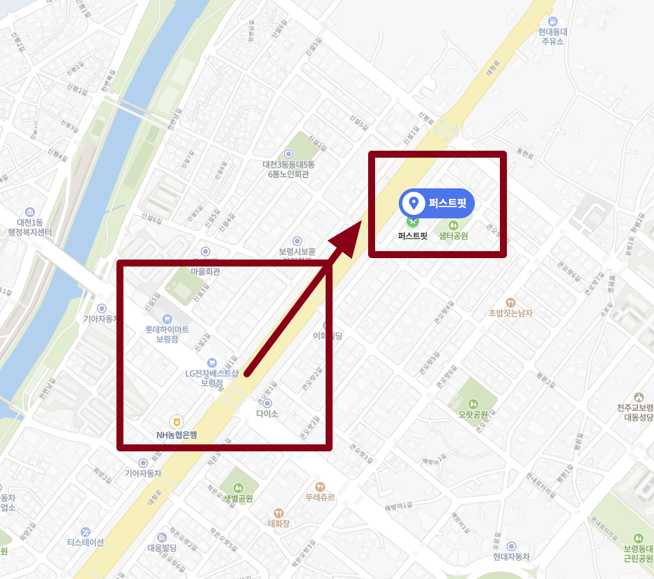 롯데하이마트 보령점, LG전자 베스트샵 보령점 그리고 다이소 충남보령점이 있는 대청로 큰 길가쪽에 있습니다!