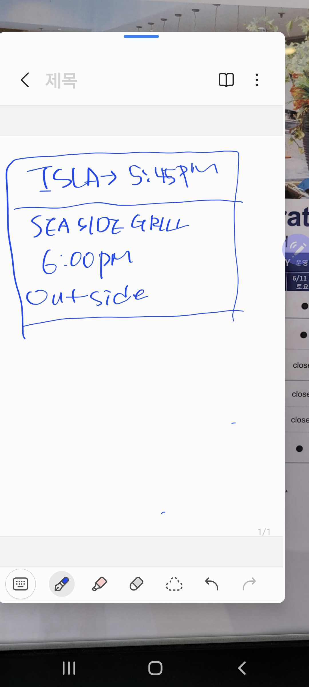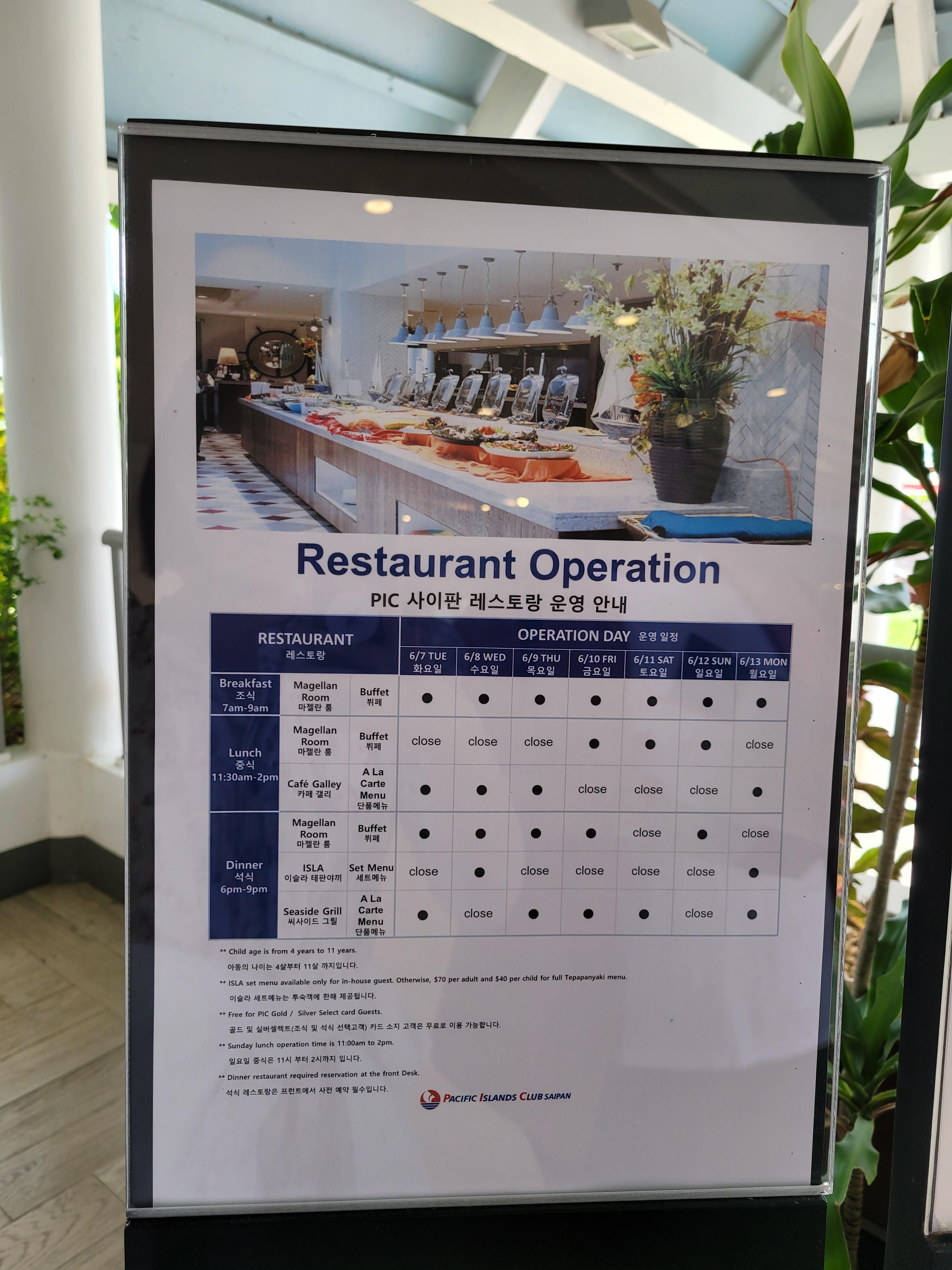 체크인 하면서 사이판 레스토랑 운영 일정을 체크했어요